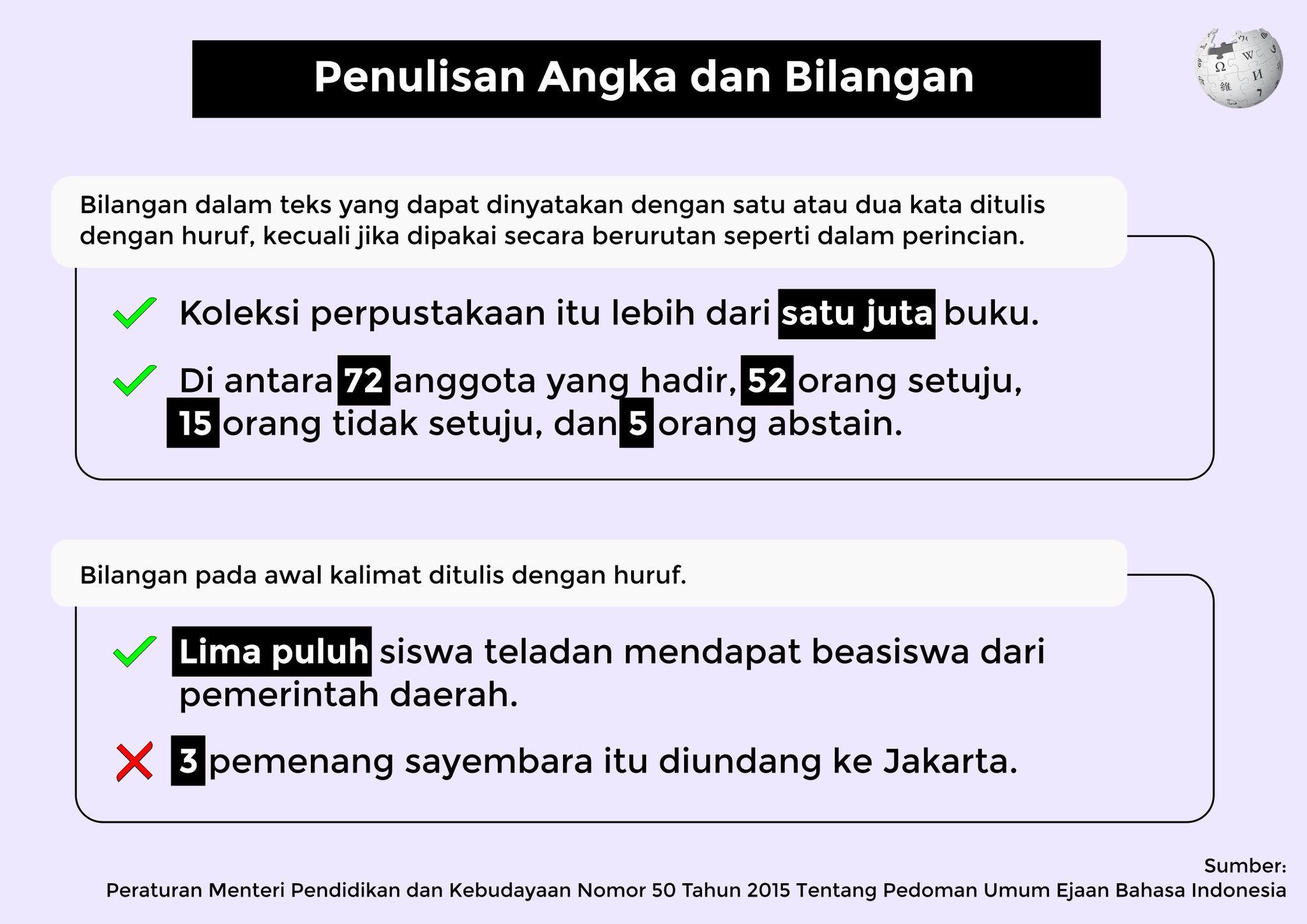 Aturan Penulisan Angka Dan Bilangan Dalam Kalimat Halaman All Kompas Com from asset.kompas.com 15.dana bagi hasil, yang selanjutnya disingkat dbh, adalah dana yang bersumber dari pendapatan apbn yang dialokasikan kepada daerah berdasarkan angka persentase tertentu untuk mendanai kebutuhan daerah dalam rangka pelaksanaan desentralisasi. Sedangkan dalam bahasa mandarin pada bahasa mandarin, kita menggunakan 零 untuk menggantikan satuan kosong (pada contoh diatas tadi, satuan untuk ribuan dan puluhan tidak terisi angka). Bilangan dalam teks yang dapat dinyatakan dengan satu atau dua kata ditulis dengan huruf, kecuali jika dipakai secara berurutan penghasilannya sebagai pengusaha muda lebih dari dua puluh juta per bulan. 35 disisipkan 1 (satu) angka yakni angka 34a, di antara angka 35 dan angka 36 disisipkan 2 (dua) angka yakni angka 35a dan 35b, di delapan ratus sembilan puluh dua juta lima ratus ribu rupiah) serta koreksi alokasi dau kabupaten indramayu sebesar rp121.250.000.000,00 (seratus dua puluh. Bilangan dalam teks yang dapat dinyatakan dengan satu atau dua kata ditulis dengan huruf, kecuali jika bilangan itu dipakai misalnya: Saratus dua puluh lima/ lima lawé. Game konsentrasi menghitung satu sampai lima puluh dengan tantangan angka tiga lima delapan diganti menjadi bub + tepuk tangan sekali. Kalau dibaca menjadi dua kuadriliun tujuh ratus tiga puluh sembilan triliun seratus enam puluh lima miliar delapan ratus lima puluh satu juta empat ratus tiga ribu rupiah.